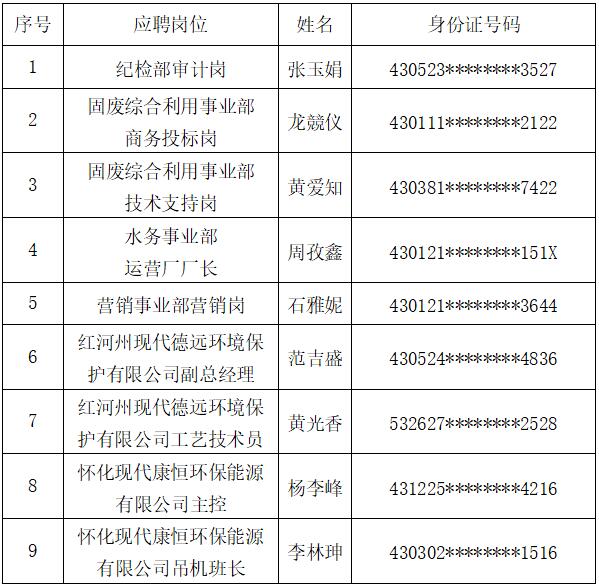 湖南现代环境科技股份有限公司第一批公开招聘部分人员网上报名、资格审查、面试、心理测评、体检、背景调查、党组织会议研究工作已完成,现将拟录用人员予以公示。